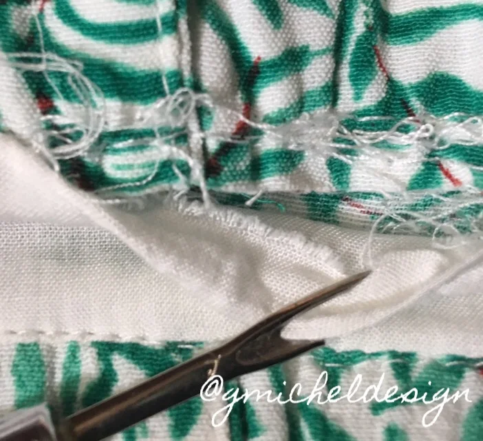 Supplies needed: fabric, needle, thread, scissors, and a thimble. Push the eye of needle with the finger that wears the thimble. I happen to guide the needle most with my left hand, but you can use your right hand and copy this technique if you prefer.